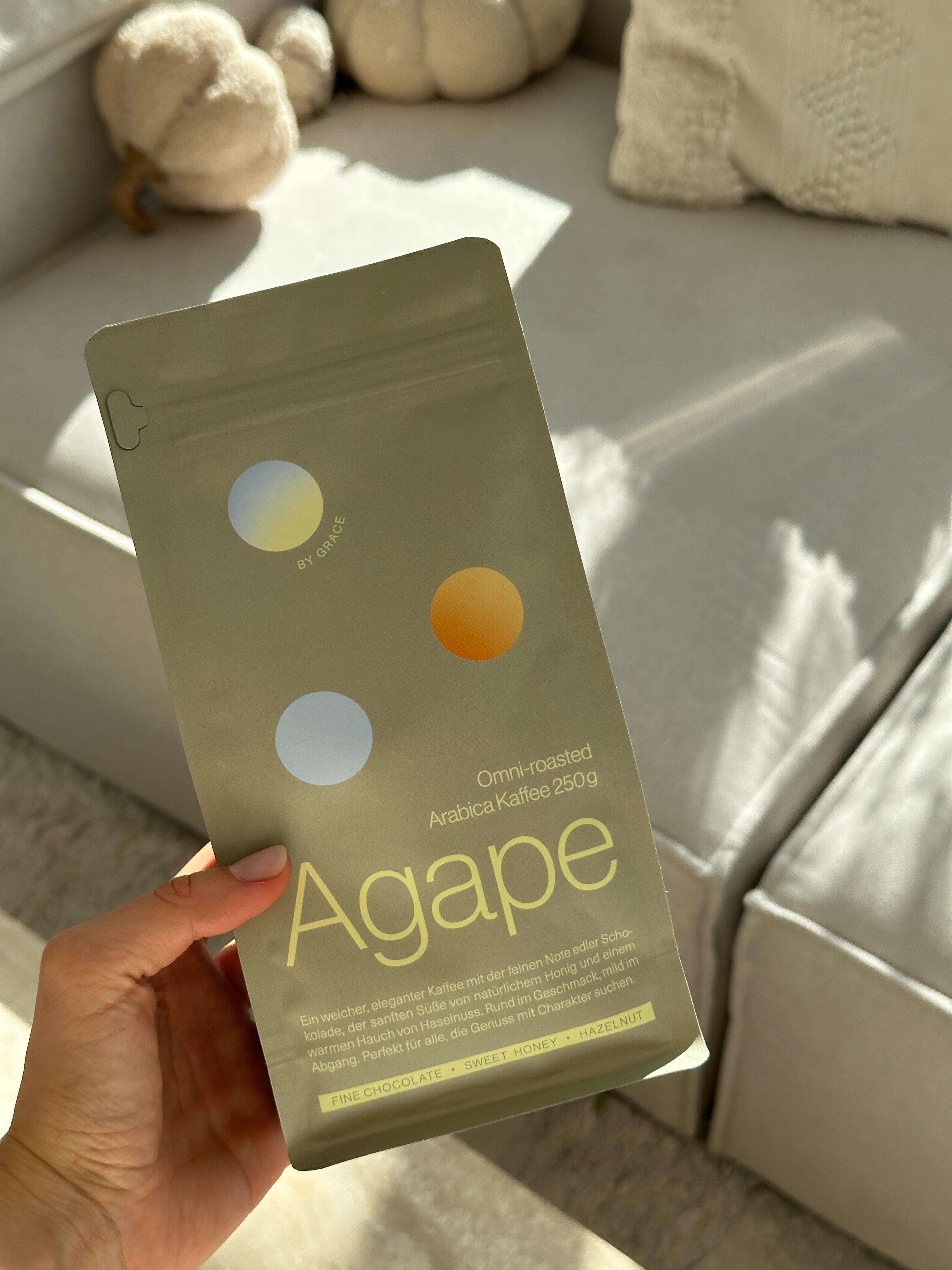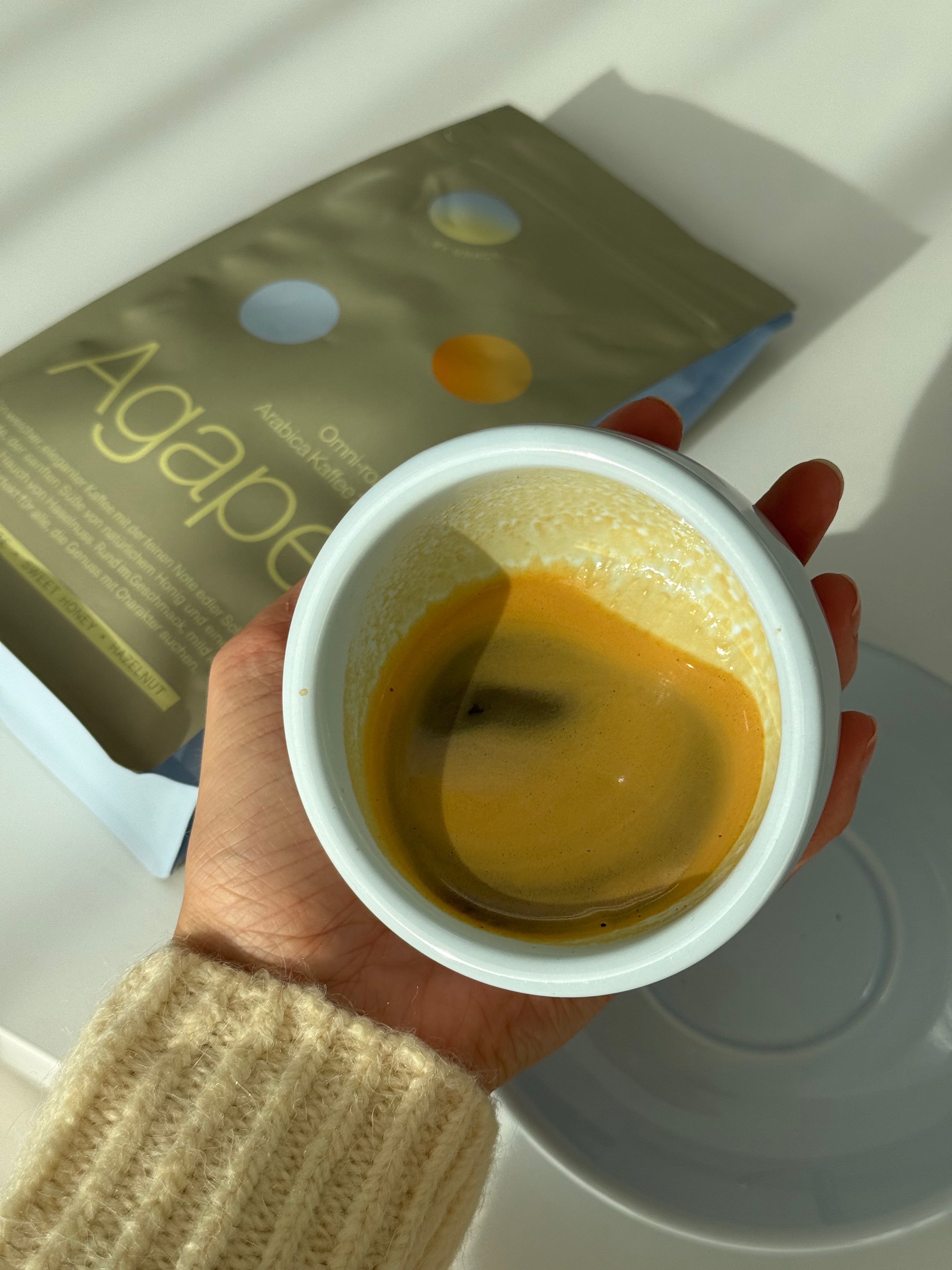 Agape besteht aus sorgfältig ausgewählten, sortenreinen Arabica-Bohnen. Diese stammen aus verantwortungsvoller Landwirtschaft und werden in einer kleinen deutschen Rösterei langsam und schonend veredelt. Das Ergebnis: Ein klarer, ausgewogener Geschmack ohne Bitterstoffe. Vollmundig, elegant, hochwertig.